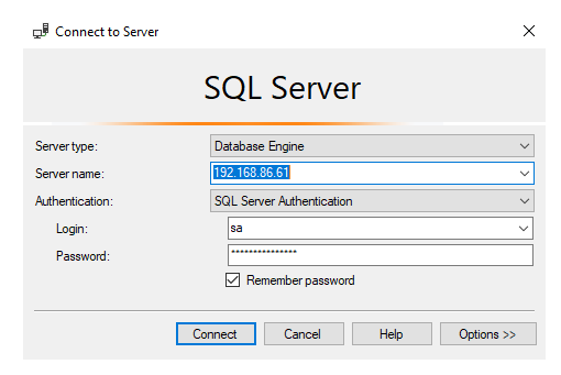 I will fire up SSMS and use the IP address along with the password that we created in our Secret to make the connection.