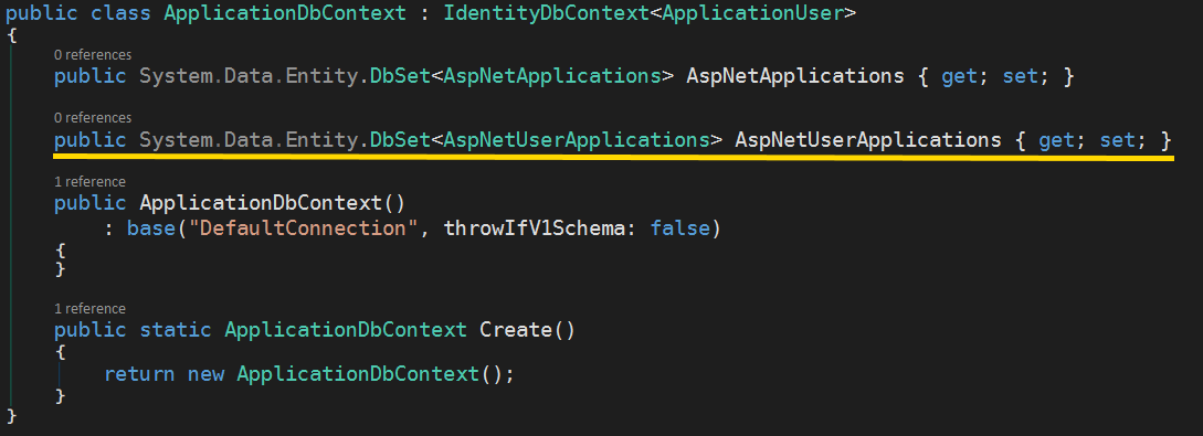 Now we have an ApplicationDbContext class with the two tables we want to add, the AspNetApplications and the AspNetUserApplications.