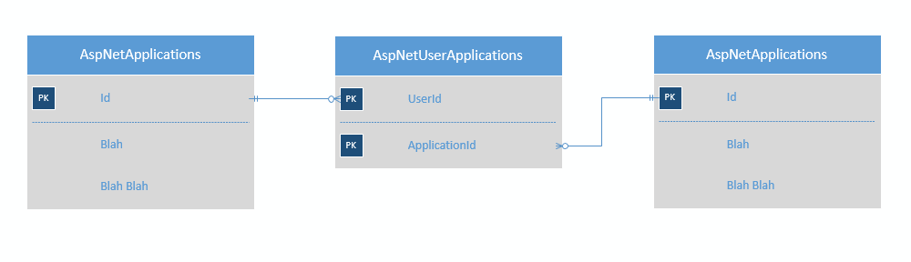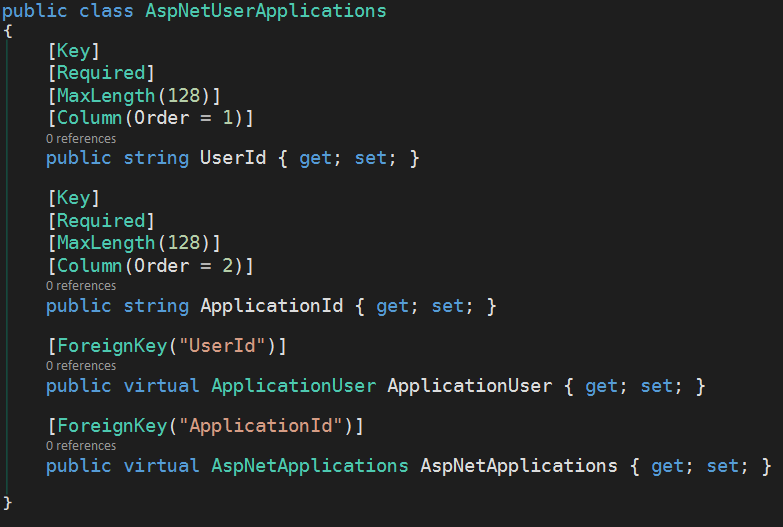 This part took me a little digging to figure out. We want the UserId to be a foreign key to the AspNetUser table and the ApplicationId to be a foreign key to the AspNetApplications table.