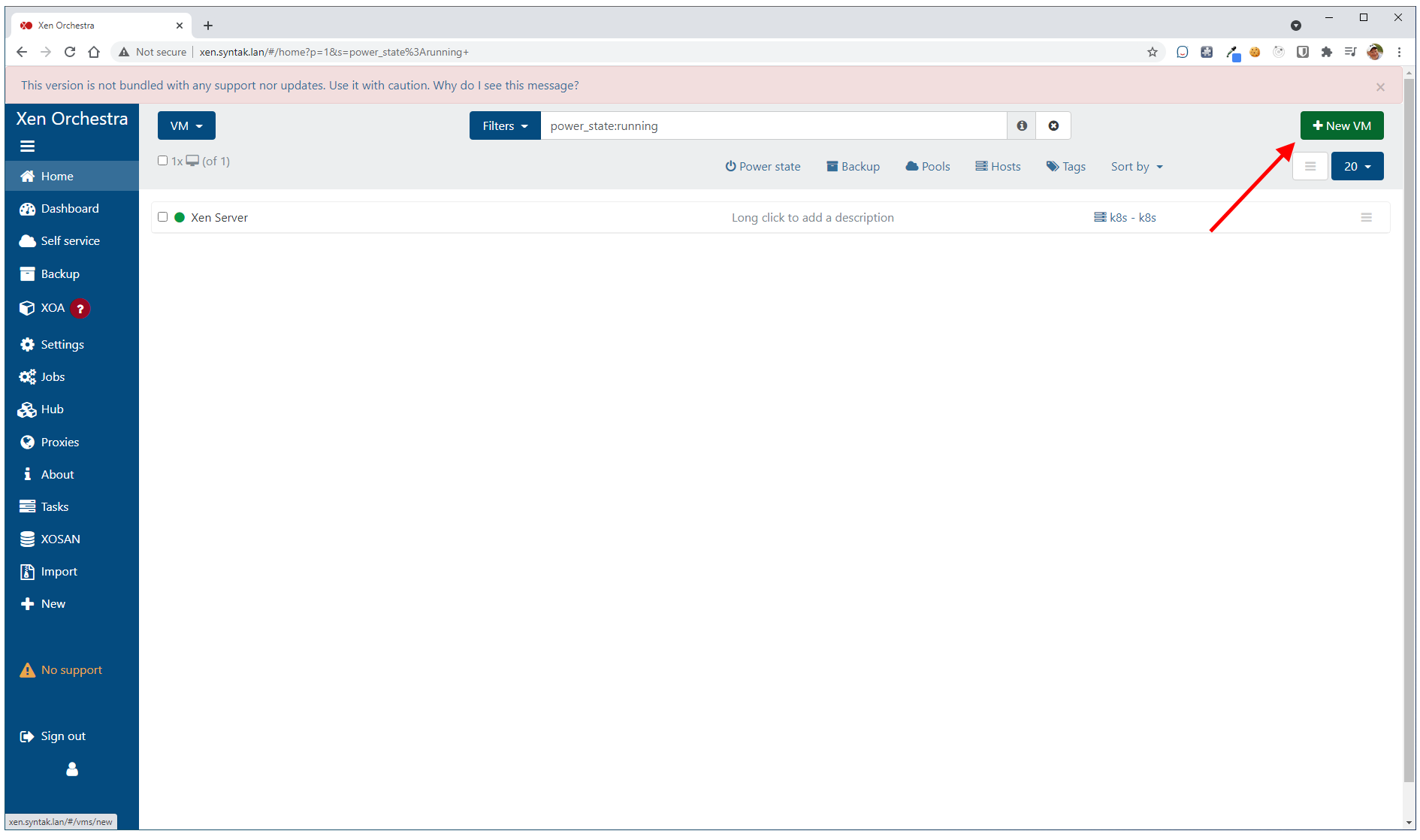 To begin, let’s go back to our Xen Orchestra server. Open up a browser and enter in the IP address to your Xen Orchestra server. Again, mine was 192.168.86.59. I also use a local DNs server, so you may see my address bar have xen.syntak.lan as the address. Don’t let that throw you.